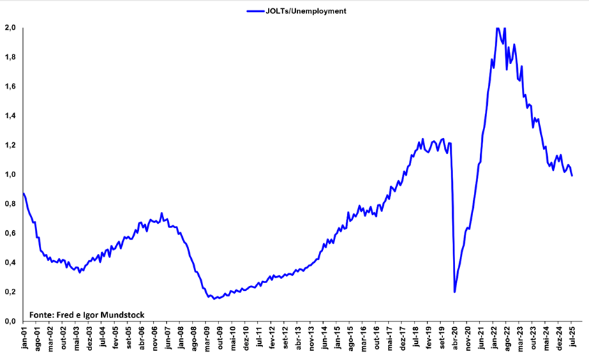 Outro ponto de destaque é que pela primeira vez desde abril de 2021 a relação JOLTs/Desempregados ficou abaixo de 1, ou seja, existem mais desempregados do que vagas de emprego hoje no EUA.