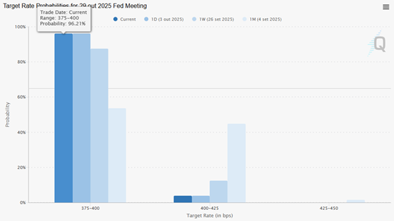 Tanto o ADP como o Challenger divulgados nesta semana reforçaram a tese de um mercado de trabalho mais fraco nos EUA, o que elevou para 96% a aposta do mercado em um corte de juros de 25bps na próxima reunião do FOMC.